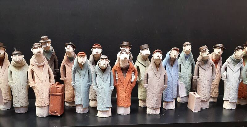 Ik zie een rij keramieken beeldjes met valiezen tussen hen op de grond. Het tafereel doet me helemaal denken aan de voorstelling van gisteren. Vanavond snel even op mijn Facebook verhaal plaatsen voor collega's en cursisten.